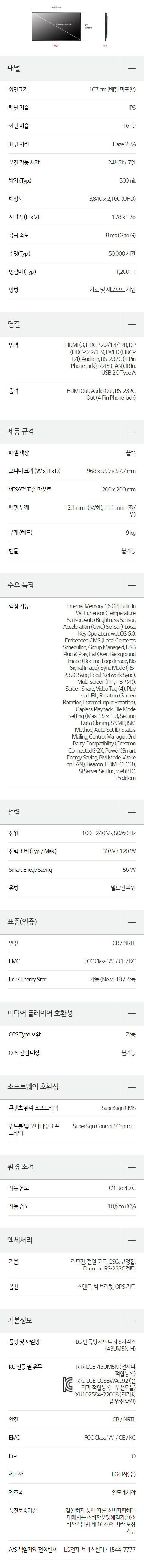 43인치 UHD DID 사이니지 TV 모니터 43UM5N