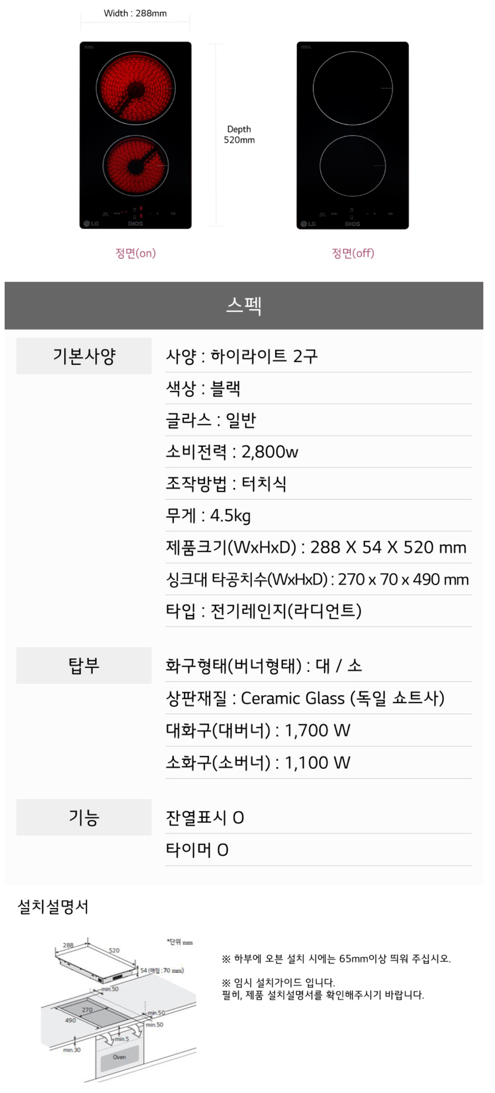 LG DIOS 빌트인 전기레인지 2구(하이라이트) BER2G