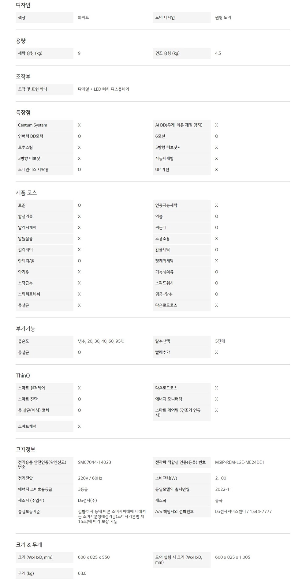 LG TROMM 빌트인 드럼세탁기건조기 9kg FR9WPB