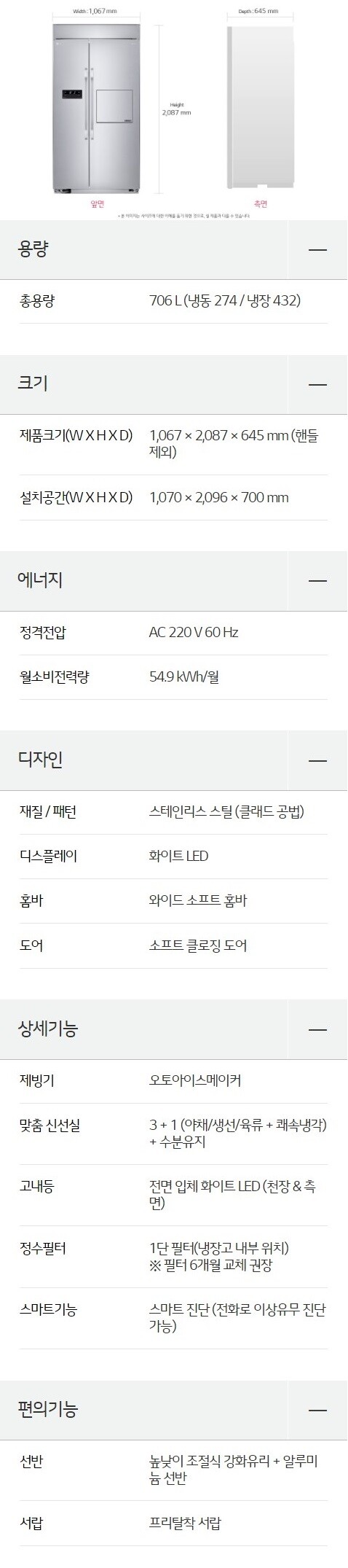 LG 빌트인 양문형냉장고 홈바형 S715SI24B