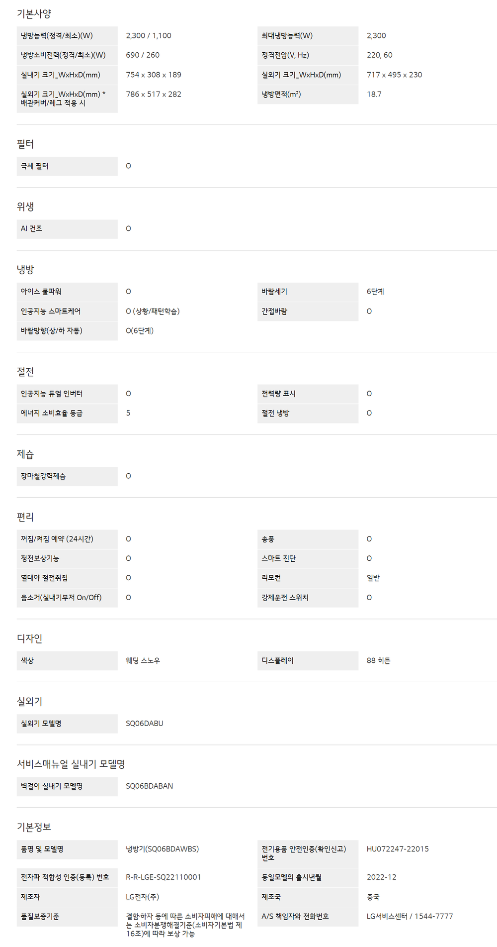 LG 벽걸이 에어컨 6평형 (기본설치비포함) SQ06BDAWBS