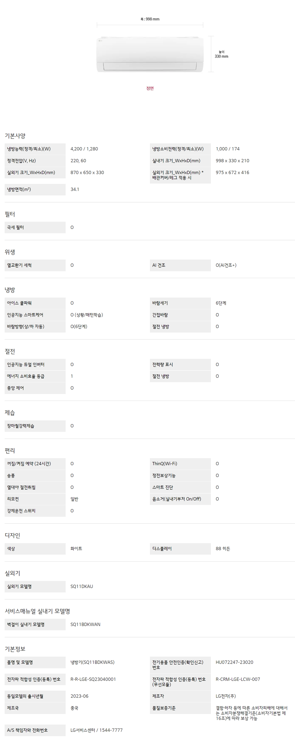 1등급 LG 벽걸이 에어컨 11평형 (기본설치비포함) SQ11BDKWAS