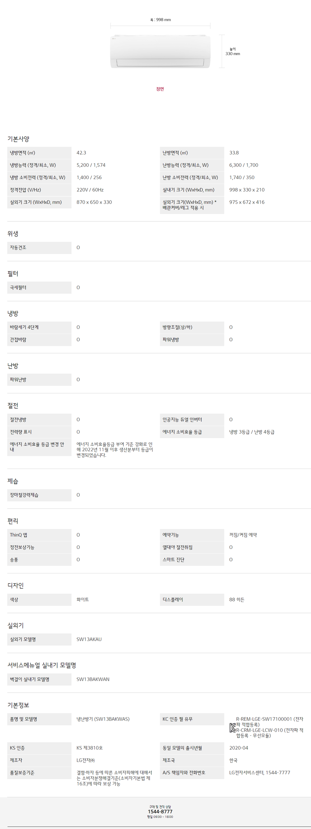 LG 벽걸이 냉난방기 13평형 SW13BAKWAS (기본설치비포함)